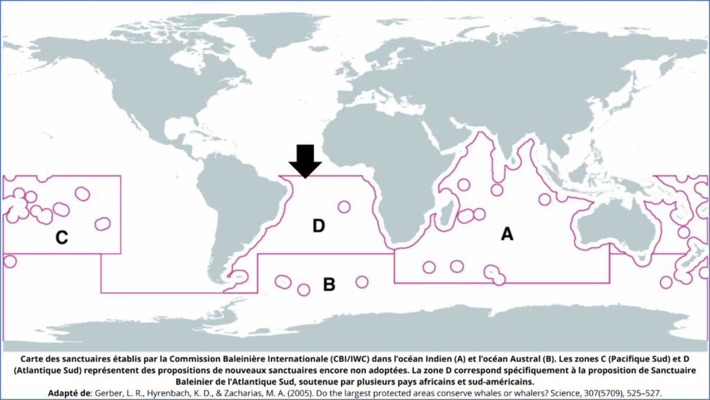 Depuis 2001, les nations du Groupe de Buenos Aires (Brésil, Argentine, Uruguay, Afrique du Sud, Gabon depuis 2010) promeuvent la création d’un Sanctuaire Baleinier de l’Atlantique Sud (Marcondes, 2020). L’objectif : protéger l’ensemble des migrations interhémisphériques des grandes baleines, encourager une recherche exclusivement non létale et encourager le développement d’une économie bleue.